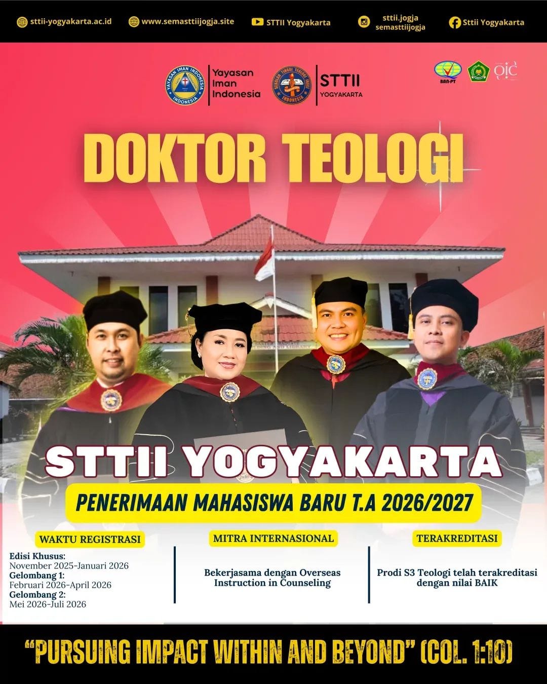 Penerimaan Mahasiswa Baru – Program Doktor Teologi (S3) STTII Yogyakarta Tahun Akademik 2026/2027 Sekolah Tinggi Teologi Injili Indonesia (STTII) Yogyakarta membuka Penerimaan Mahasiswa Baru (PMB) untuk Program Doktor Teologi (S3)