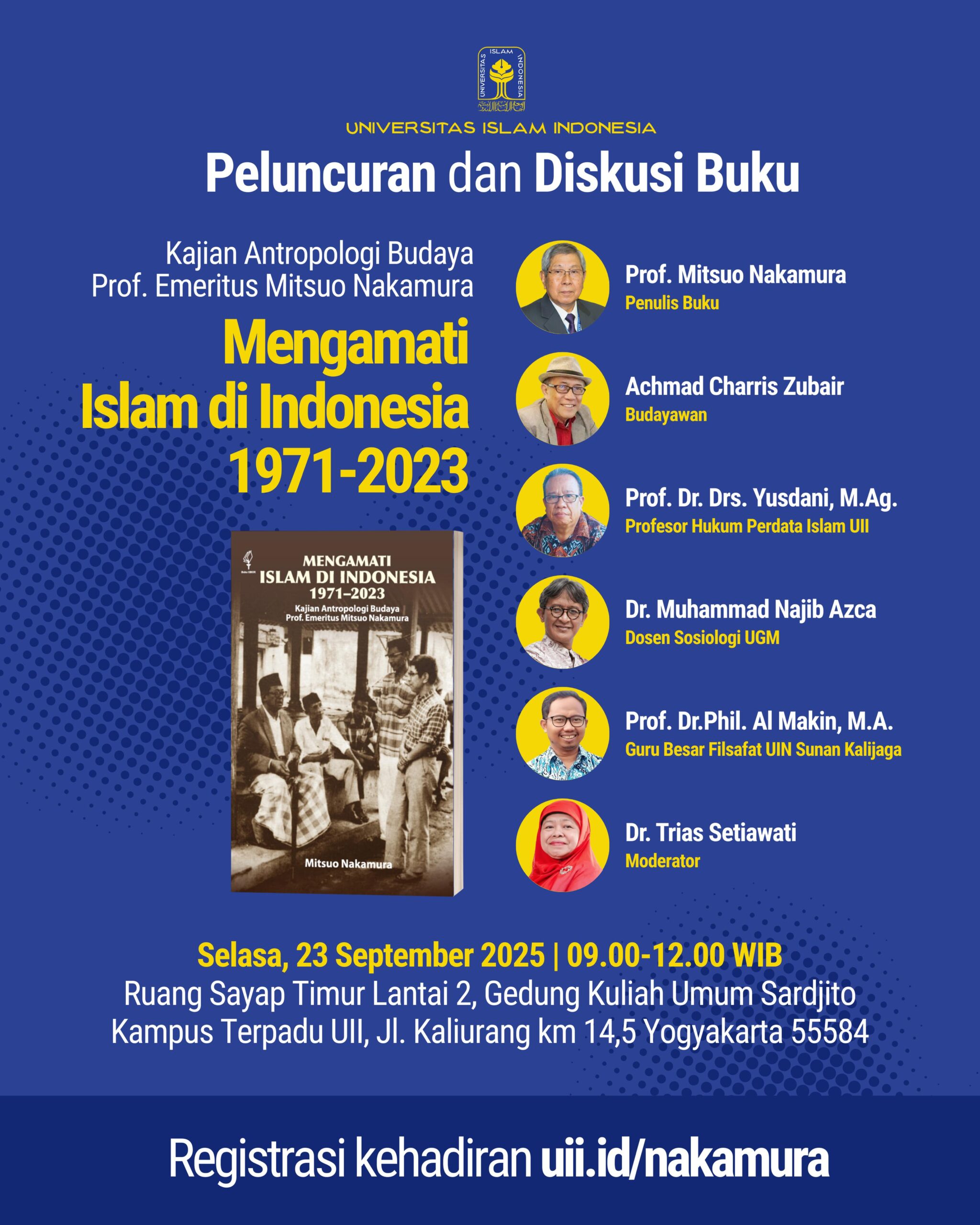 Universitas Islam Indonesia (UII) mengundang masyarakat akademik, praktisi kebudayaan, mahasiswa, dan umum untuk menghadiri peluncuran sekaligus diskusi buku penting bertajuk Mengamati Islam di Indonesia 1971–2023. Buku ini merupakan kajian antropologi budaya karya Prof. Emeritus Mitsuo Nakamura yang merekam dinamika kehidupan beragama dan praktik Islam di Indonesia selama lebih dari lima dekade.